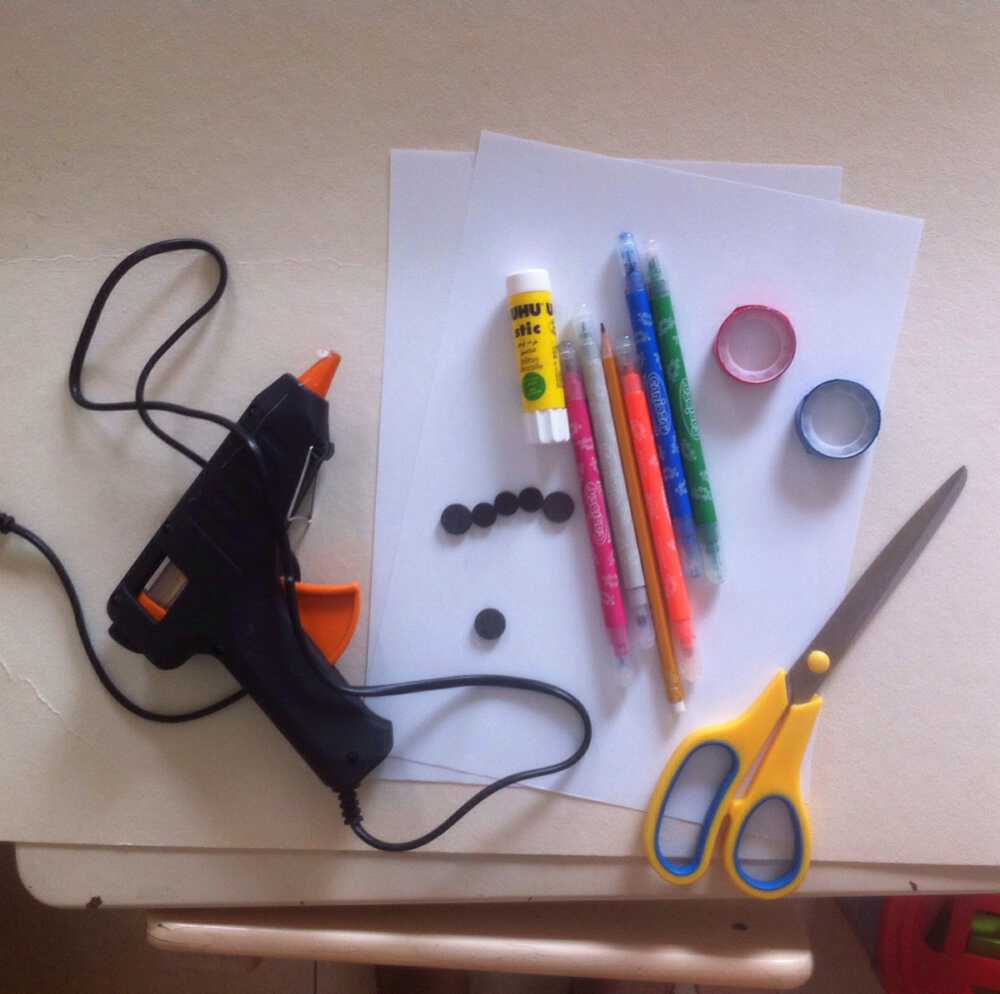 מספריים, טושים, ואשי טייפ (אפשר גם נייר דבר רגיל), קרטון ביצוע, מגנטים, דבק סטיק / לבן, דבק חם (אפשר גם עם דבק מגע).